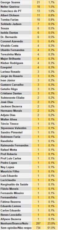 Entre os políticos de Mossoró os mais lembrados foram o ex-vereador Soldado Jadson (SD) e a deputada estadual Isolda Dantas (PT).