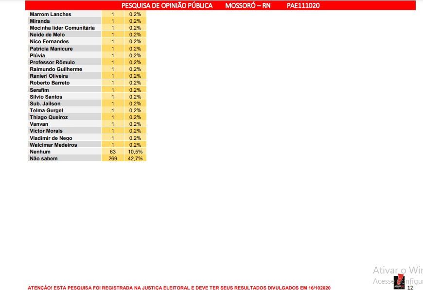 A pesquisa foi realizada nos dias 9 e 10 de outubro e tem margem de erro de 3,9% com intervalo de confiança de 95%. O Insituto AgoraSei registrou a pesquisa na Justiça Eleitoral com o número de registro RN-05763/2020.
