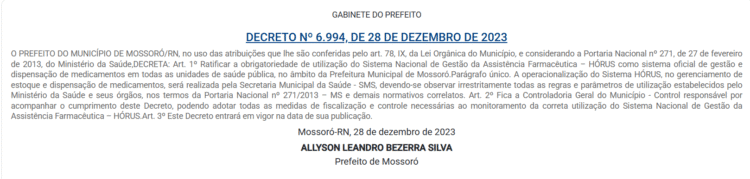 Um dos principais argumentos do prefeito Allyson Bezerra (UB) em sua defesa sobre as suspeitas de corrupção é o de que a Prefeitura de Mossoró integra o Sistema Nacional de Gestão da Assistência Farmacêutica – HÓRUS.