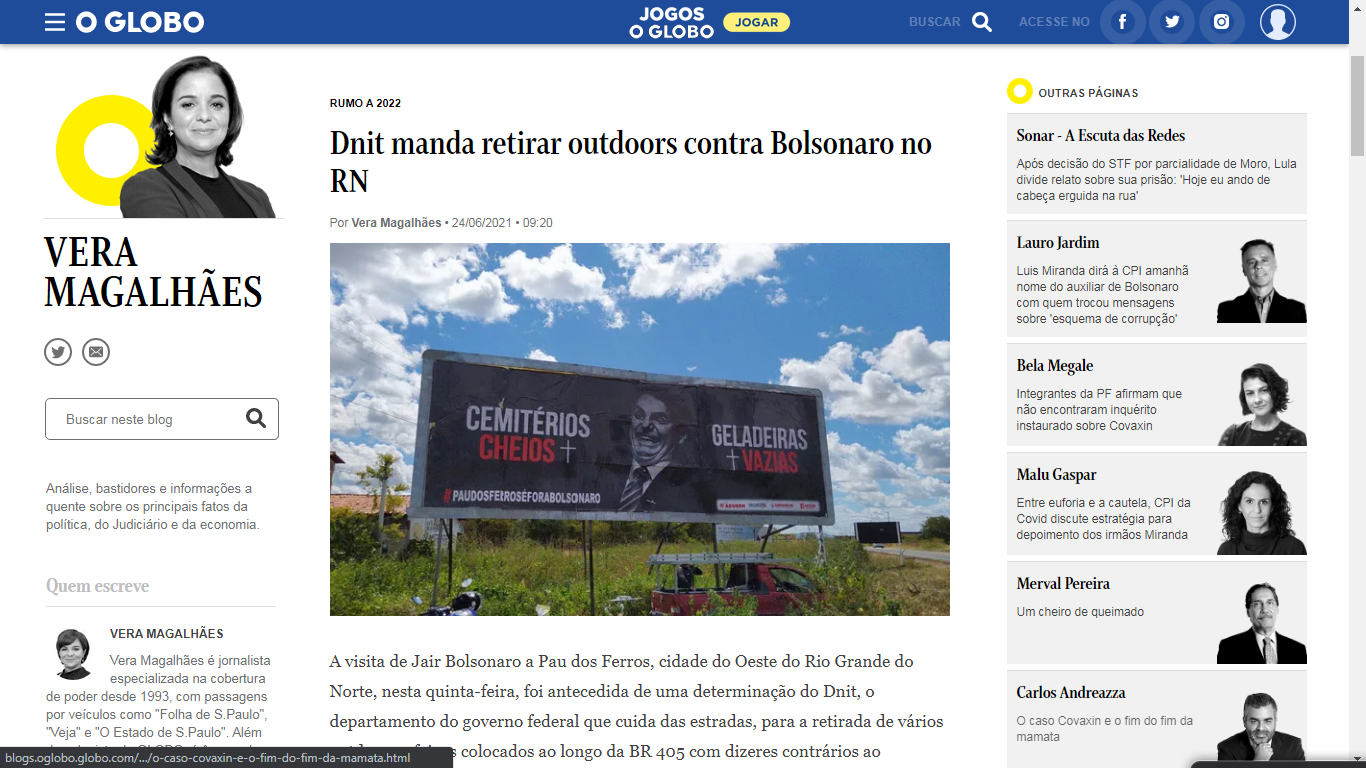 O Globo – Dnit manda retirar outdoors contra Bolsonaro no RN