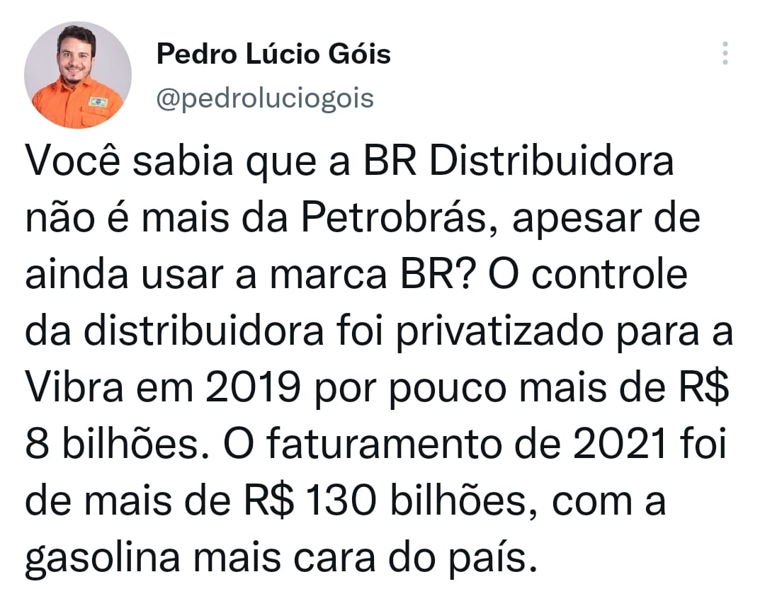 “Você sabia que a BR Distribuidora não é mais da Petrobrás, apesar de ainda usar a marca BR? O controle da distribuidora foi privatizado para a Vibra em 2019 por pouco mais de R$ 8 bilhões. O faturamento de 2021 foi de mais de R$ 130 bilhões, com a gasolina mais cara do país”, postou no Twitter.