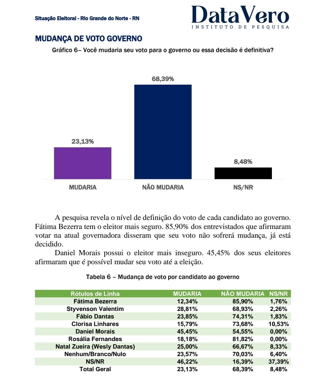 Já para o Governo, 68% não muda o voto e 23% admite trocar de candidato. O voto mais fidelizado é o da governadora Fátima Bezerra (PT) que é de 85,9%. O ex-vice-governador Fábio Dantas (SD) é de 74,3% e o senador Styvenson Valentim (Podemos) 68,9%.