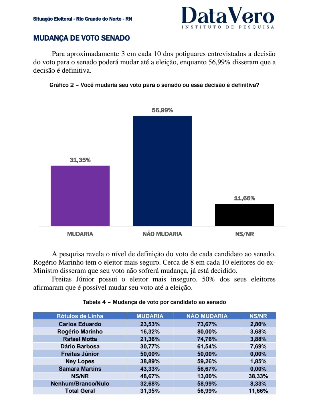 Para o Senado, o voto médio é o menos fidelizado alcançando 57% e 31,3% admite mudar de voto.O voto mais fidelizado é o do ex-ministro Rogério Marinho (PL) com 80%, seguido73,6% de Carlos Eduardo Alves (PDT) e 74,7% de Rafael Motta (PSB).