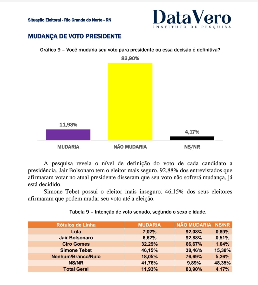De acordo com a sondagem, 83,9% dos eleitores não pensam em mudar o voto para presidente, enquanto 11,9 admitem trocar o voto.