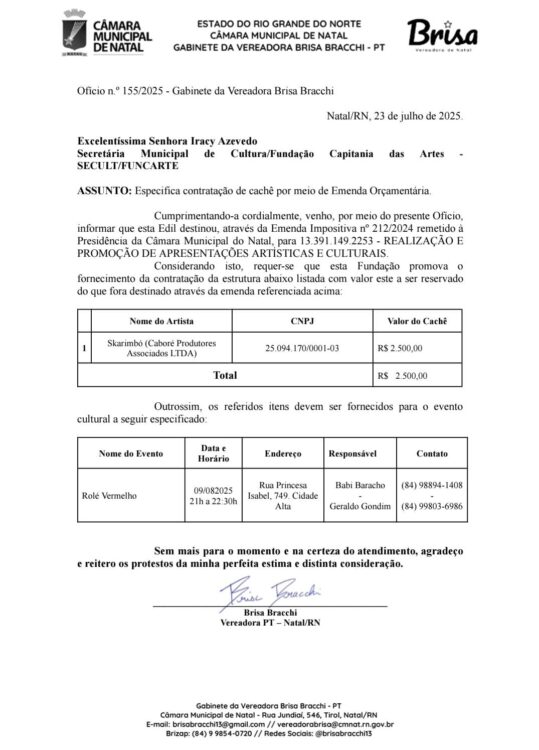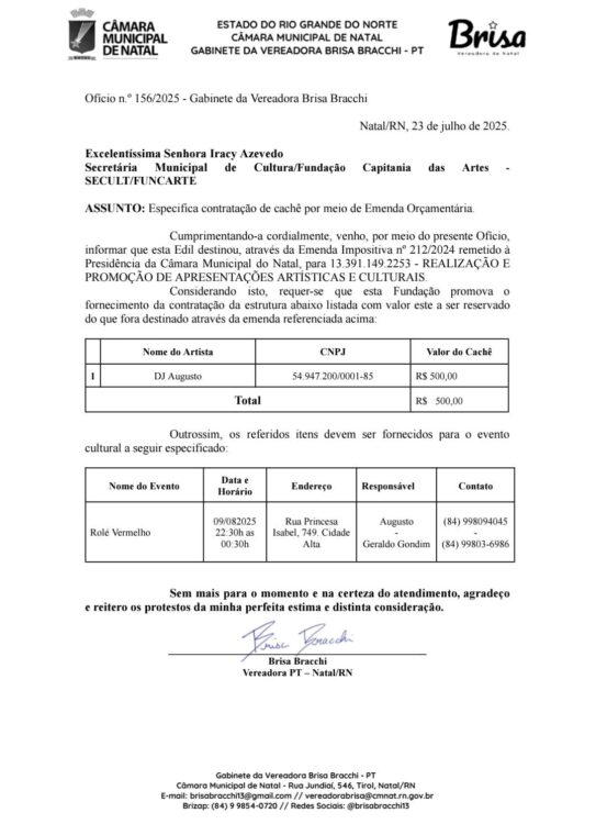 “Nós destinamos recursos para o pagamento de três cachês, de três artistas renomados, conhecidos, que já se apresentaram em muitos outros lugares da cidade. Muita gente tem questionado o caráter que o evento teve porque falava do Bolsonaro na cadeia, que foi uma notícia que surgiu na semana que o evento aconteceu”, disse Brisa.