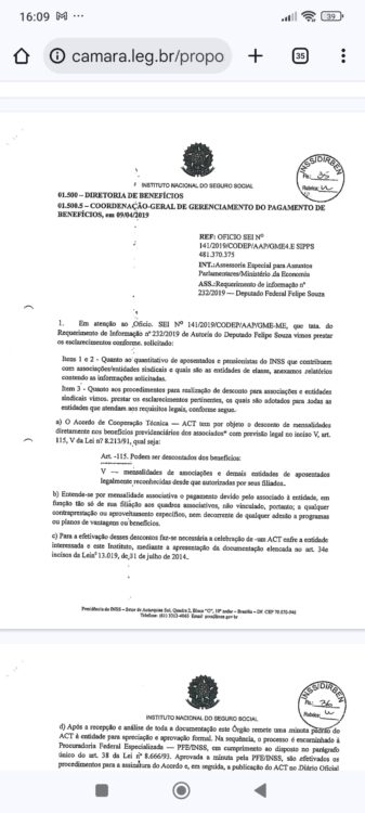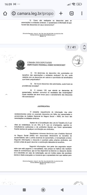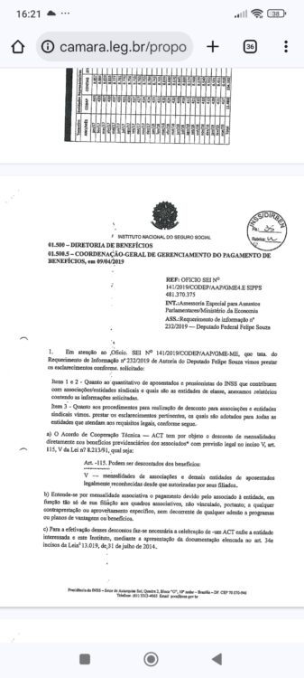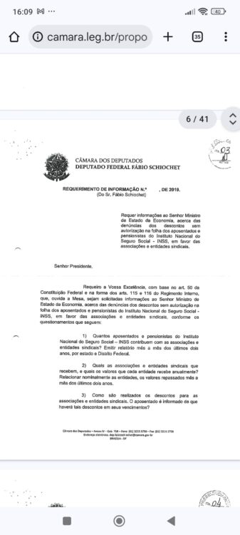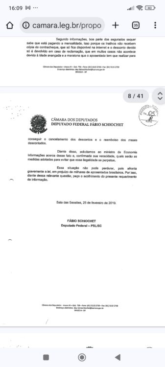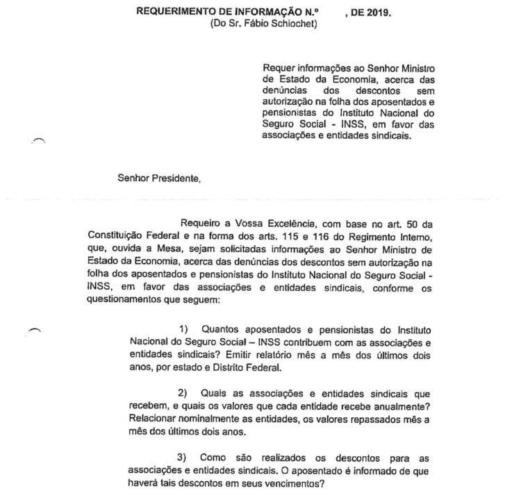 A reportagem mostra que em 25 de fevereiro de 2019, o deputado federal bolsonarista Fabio Schiochet bolsonarista (PSL-SC) solicitou ao então ministro da economia Paulo Guedes informações sobre os descontos nos contracheques dos aposentados.