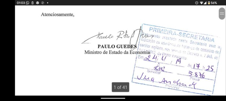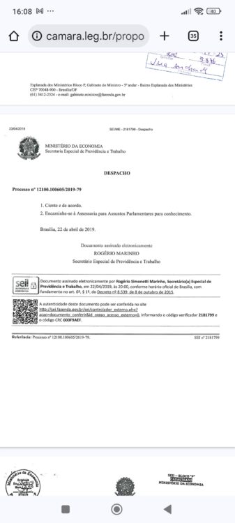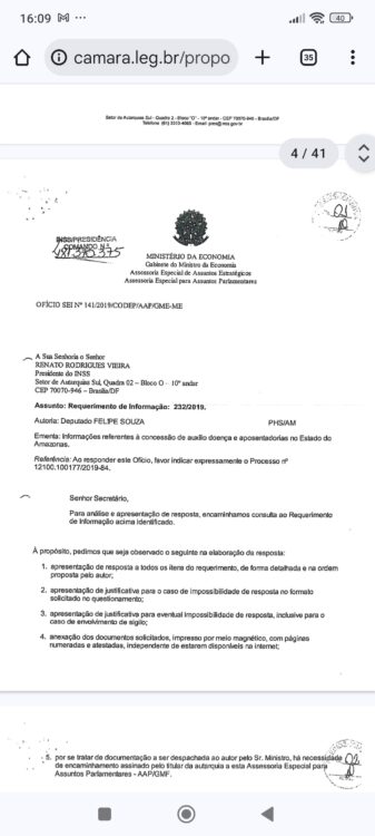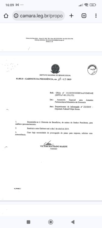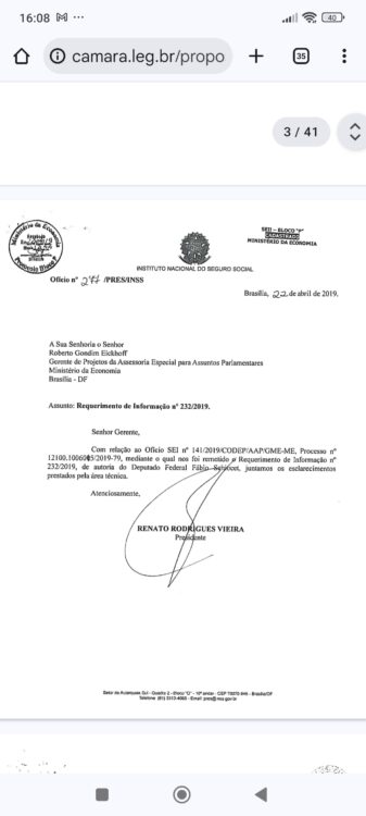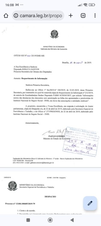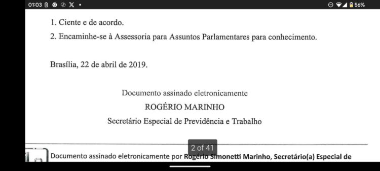 Em 22 de abril, Rogério Marinho, na época secretario nacional de previdência, informa ter tomado ciência do pedido de informações.