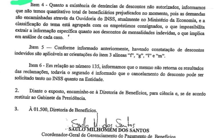 O caso foi repassado ao presidente do INSS Renato Vieira que recebeu dos auxiliares a informação de que só seria possível avaliar a existência de irregularidades analisando caso a caso porque havia uma situação de mistura com os descontos de empréstimos consignados.
