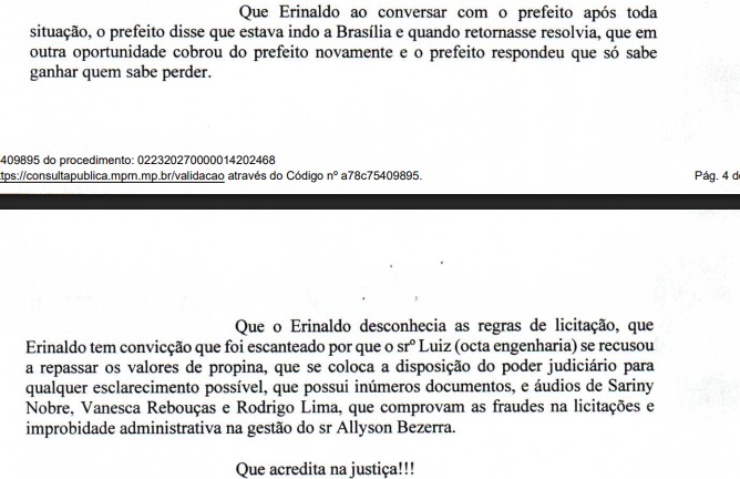 Erinaldo condicionou aceitar o serviço, para o qual não estava habilitado via licitação, uma reunião com Allyson e Rodrigo Lima. O prefeito não foi a reunião, mas lhe foi apresentadas garantias como fazer o empresário reaver o lucro das obras anteriores via equilíbrio e reajuste das obras das praças das Barrocas, Basquete, Abolições III e IV.