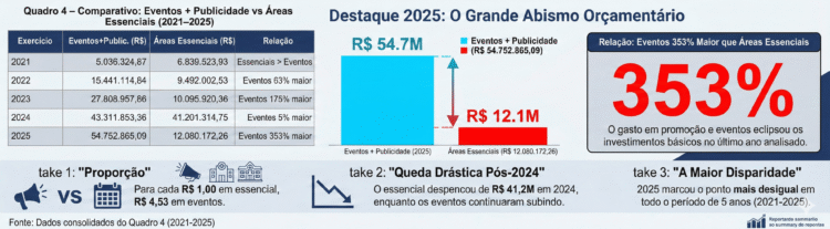 O relatório destaca que o ano de 2025 consolidou uma inversão de prioridades sem precedentes. Após um breve respiro em 2024 — único ano em que as duas categorias caminharam próximas na gestão de Allyson, ele optou por um corte drástico no essencial, reduzindo o investimento em serviços básicos de R$ 41 milhões para R$ 12 milhões, enquanto a verba de publicidade e eventos não parou de subir, atingindo seu ápice histórico.