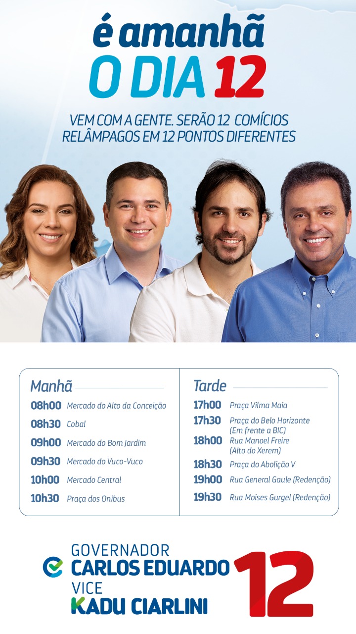 A data de hoje, 12, número do partido de Carlos, foi escolhida para um esforço concentrado no segundo maior colégio eleitoral do Rio Grande do Norte. Durante todo o dia serão realizadas atividades de campanha com as presenças do candidato a vice-governador Kadu Ciarlini (PP), da deputada estadual Larissa Rosado (PSDB) e do deputado federal Beto Rosado (PP).