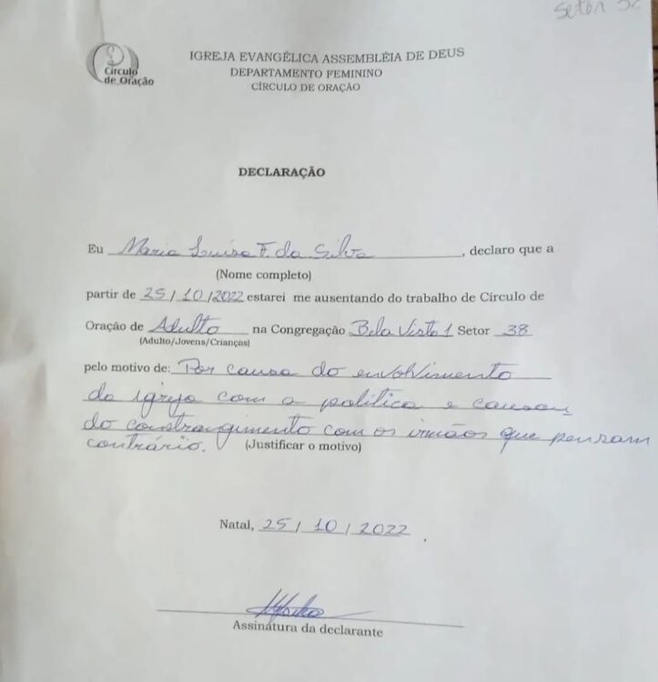Nas eleições presidenciais de 2022 eles viram a igreja de Cristo virar um comitê de campanha, os grupos de WhatsApp que antes eram repletos de mensagens bíblicas deram lugar a notícias falsas, textos em tom alarmante denunciando a “ameaça petista”, e áudios de pedido de oração pela vitória de Bolsonaro. Pessoas com grande influência dentro da igreja orientando os fiéis de como eles deveriam votar, não fosse suficientemente imoral silenciar a respeito das “fake news” nos grupos, como se existisse um “salvo-conduto” para mentir, desde que seja contra o adversário, muitas vezes são eles próprios os propagadores dessas mentiras. Quando a política da mentira e da intolerância entrou na Assembleia de Deus, Cristo saiu pela porta dos fundos, meus pais, como bons cristãos, seguirão seus passos.