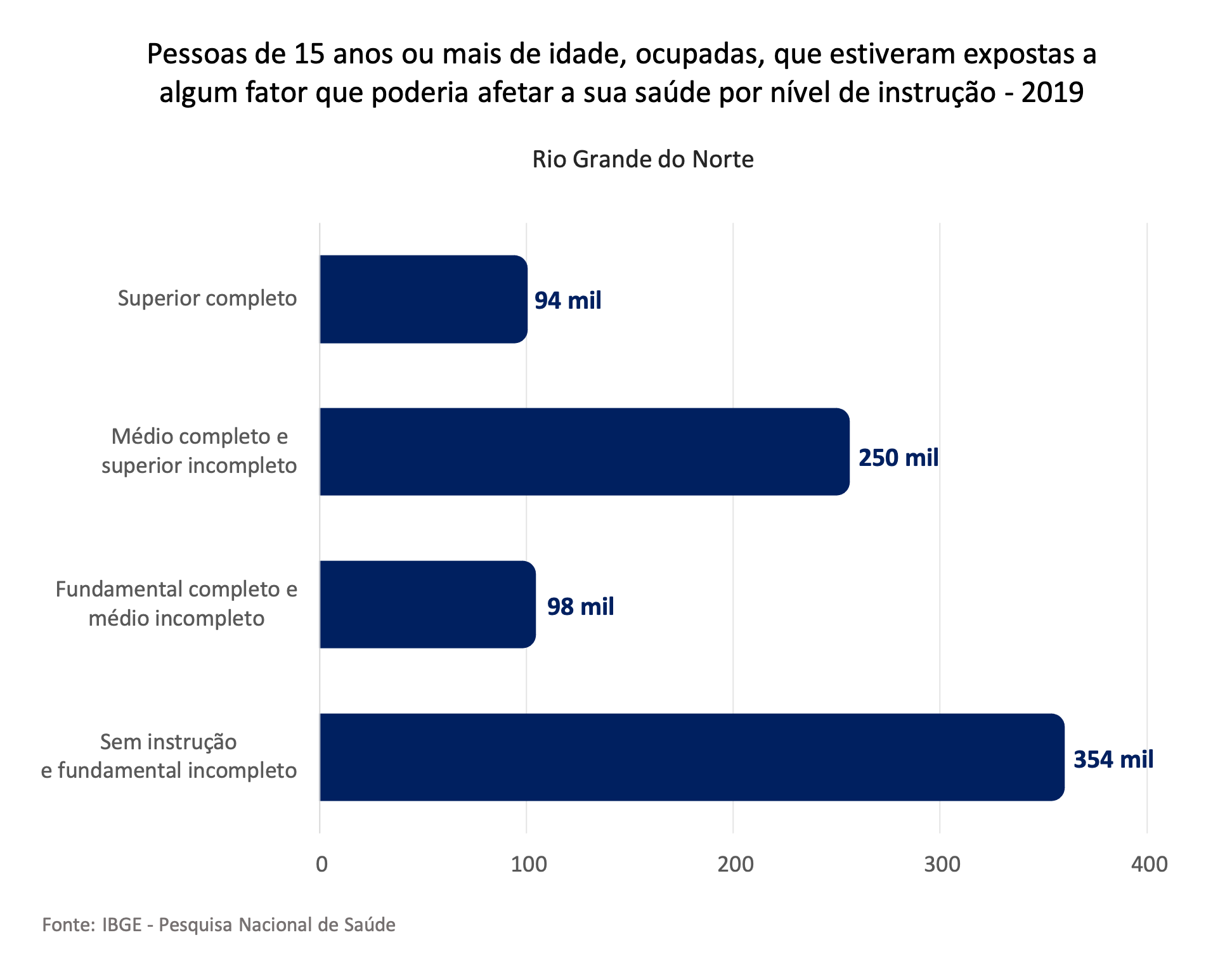 A exposição a riscos é maior entre pessoas com baixa escolaridade. Entre pessoas sem instrução ou com ensino fundamental incompleto, 354 mil (67,8% desse grupo) estão expostas a fatores de risco. Já entre as pessoas com ensino superior completo, 94 mil trabalham em ambientes com riscos à saúde (35,8% desse grupo).