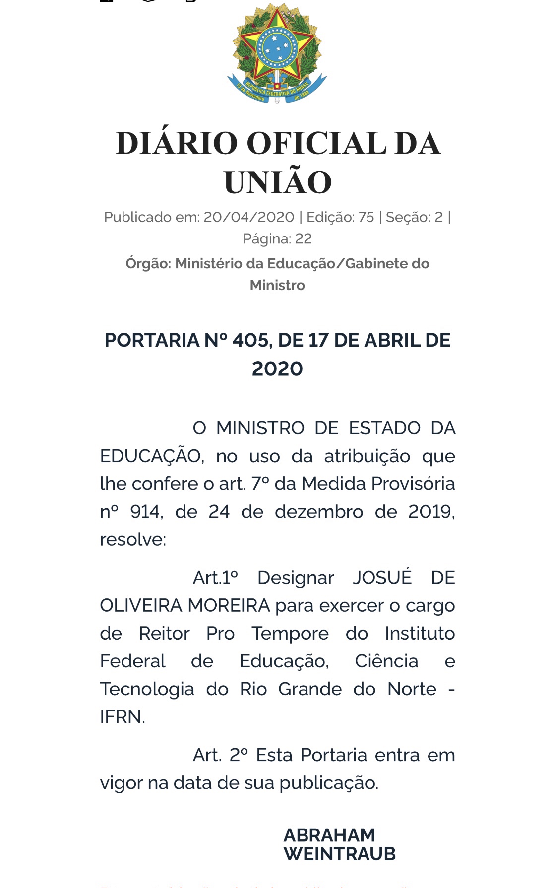 Hoje o Diário Oficial da União traz a número 405 de 17 de abril de 2020 com o ministro da educação Abraham Weintraub nomeando-o na condição de pró-tempore.