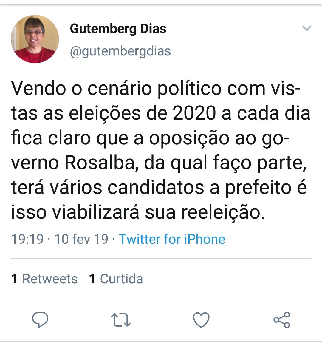 O ex-candidato a prefeito de Mossoró Gutemberg Dias (PC do B) usou o Twitter para reforçar o alerta feito pelo Blog do Barreto (ver AQUI) a respeito da falta de foco e liderança da oposição que poderia favorecer uma reeleição da prefeita Rosalba Ciarlini (PP).