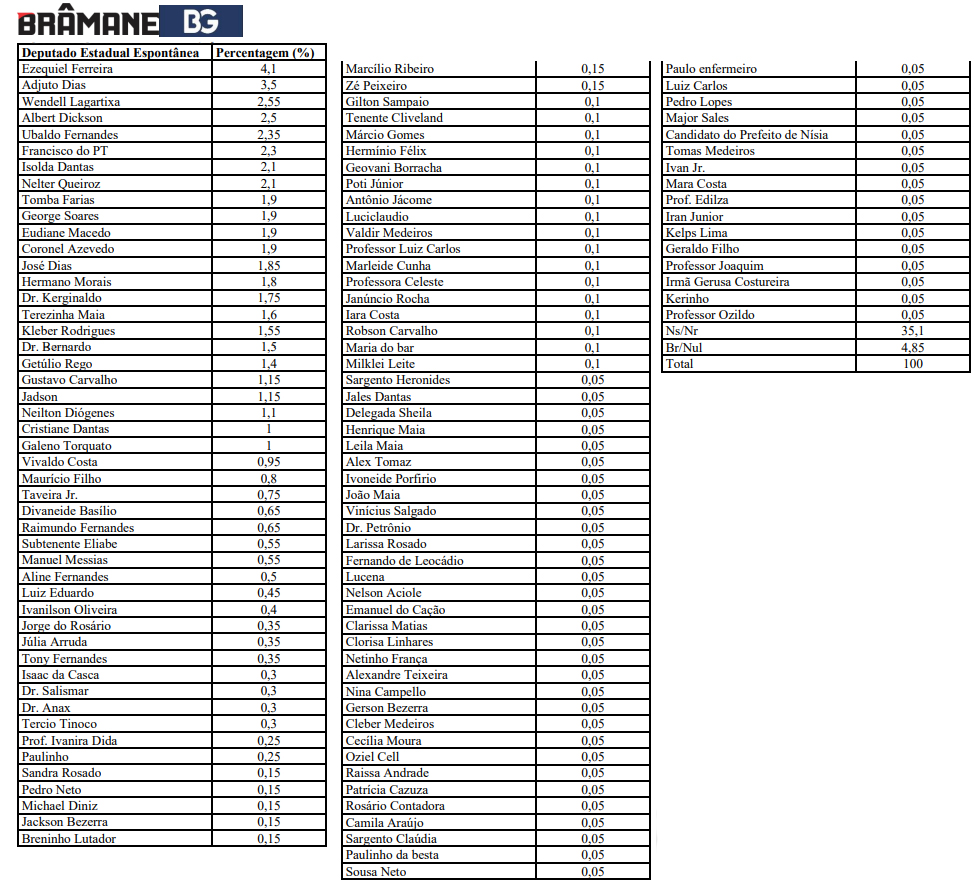 O presidente da Assembleia Legislativa Ezequiel Ferreira de Souza (PSDB) foi o mais citado na pesquisa Brâmane para deputado estadual divulgada hoje pelo Blog do BG.