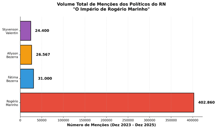 Para entender o campo de batalha, analisamos quase dois anos de menções online de quatro figuras centrais da política potiguar: a governadora Fátima Bezerra, o senador e ex-ministro de Bolsonaro, Rogério Marinho (PL), o senador e ex-policial, Styvenson Valentin (PODE), e o prefeito de Mossoró, Allyson Bezerra.