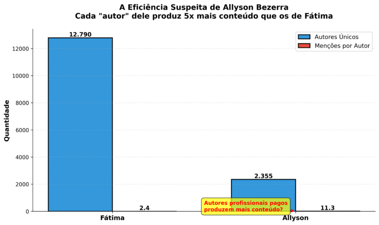 Os dados de “eficiência” confirmam a suspeita. Fátima tem 5 vezes mais “autores únicos” (pessoas falando sobre ela) que Allyson. No entanto, cada “autor” de Allyson produz, em média, 11,3 menções, contra apenas 2,4 de Fátima.