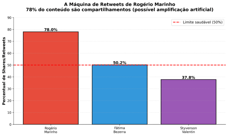 Mas no mundo digital, nem tudo que reluz é ouro. O império de Marinho é construído sobre uma base frágil: quase 78% de todo o conteúdo sobre ele são apenas compartilhamentos. É como um show com milhões de ingressos distribuídos, mas onde a maioria do público está apenas repassando o convite, sem criar seu próprio barulho. É um sinal clássico de amplificação artificial, um exército de perfis cuja única missão é ecoar a mensagem do chefe.