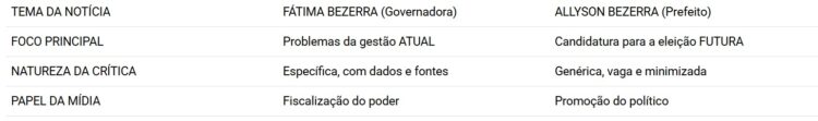 A diferença de estratégia se reflete no espelho do noticiário. Quando analisamos o conteúdo das notícias sobre os dois chefes de executivo, Fátima e Allyson, o contraste é brutal.