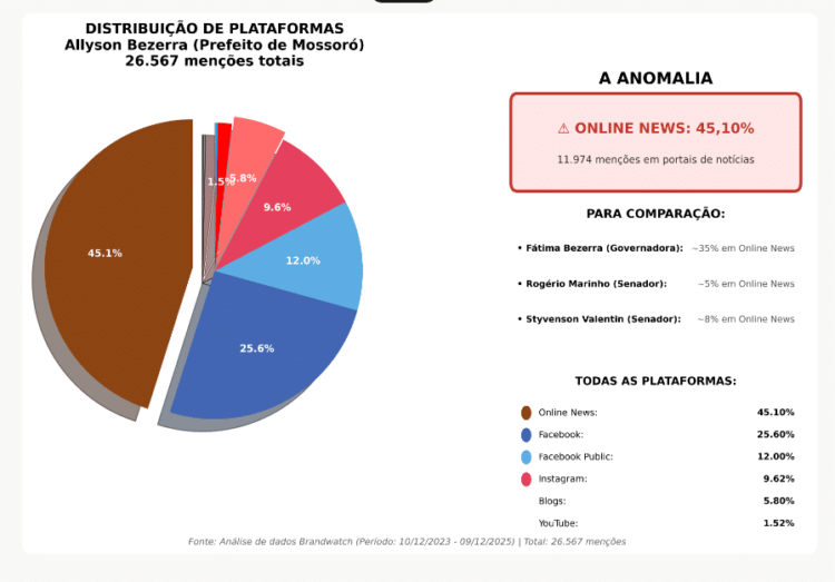 O MP acusa Allyson Bezerra de abuso de poder político e econômico por, supostamente, usar a máquina da prefeitura para se promover. A acusação central é que a Prefeitura de Mossoró, que tinha um orçamento de publicidade de R$ 841 mil, empenhou mais de R$ 4,3 milhões com agências de comunicação. Esse dinheiro, segundo o MP, era usado para subcontratar os mesmos blogs, portais e influenciadores que hoje constroem a imagem de Allyson como “líder nas pesquisas”.