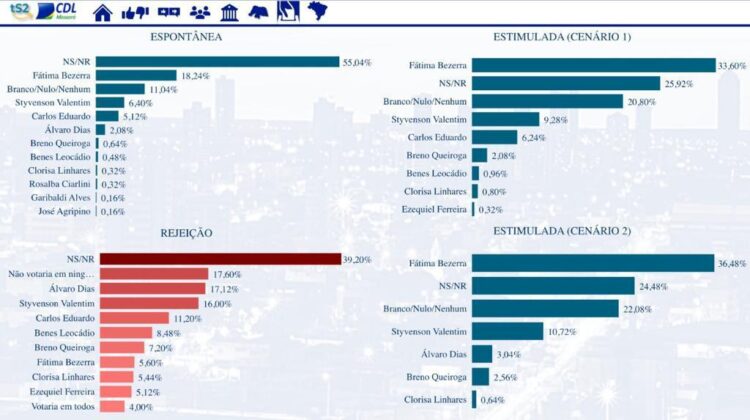 A governadora Fátima Bezerra (PT) lidera a corrida à reeleição com uma vantagem superior a 20 pontos percentuais dentro de Mossoró. É o que apontam os números da pesquisa TS2 realizada em parceria com a Câmara dos Dirigentes Lojistas (CDL).