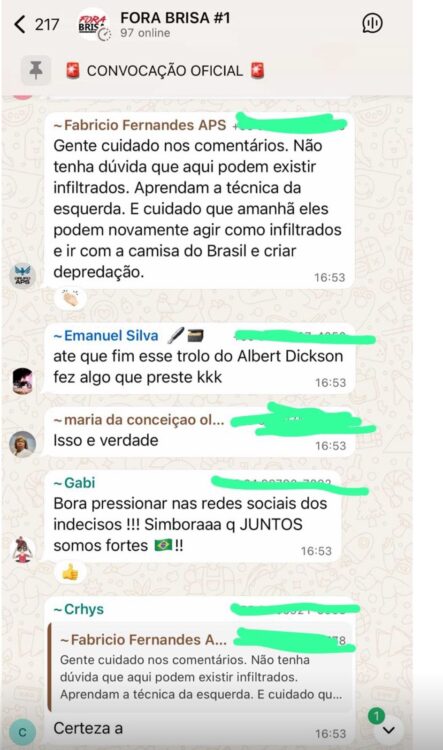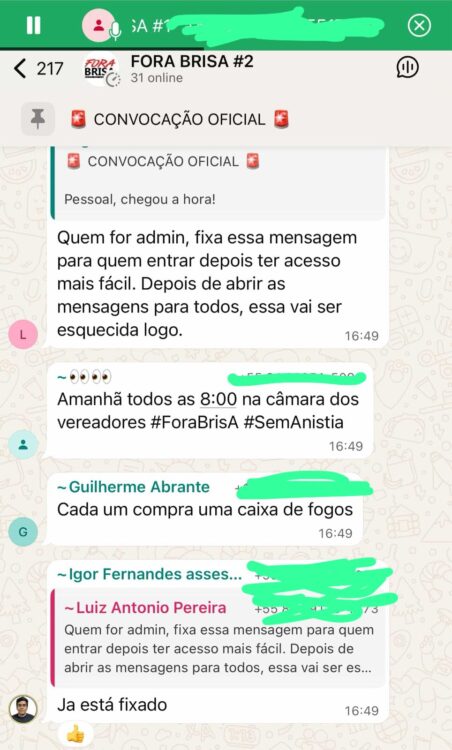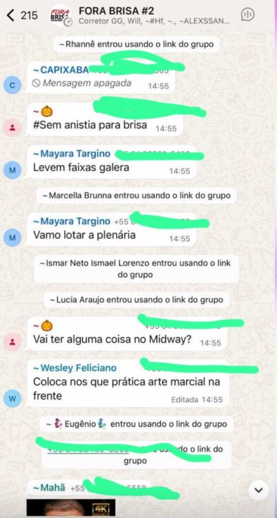 Já grupo de mobilização pela cassação de Brisa, um dos integrantes identificado como Wesley Feliciano, sugere colocar praticantes de artes marciais na linha de frente.