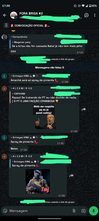 Já no final da membros defenderam o uso de spray de pimenta para usar contra petistas em caso de confronto.