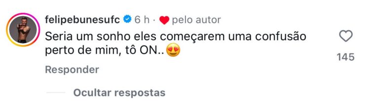 Um dos primeiros comentários foi do perfil identificado como “Felipinho Bunes” que se identifica como lutador de MMA no Instagram. Ele afirma que está pronto para a briga. “Seria um sonho eles começarem uma confusão perto de mim, tô ON”, declarou.