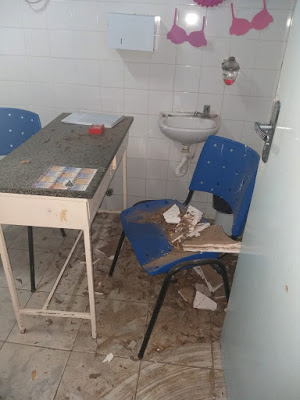 Fica, no entanto, o trauma psicológico e o mal-estar para quem, além de estar trabalhando com seus salários atrasados, ainda tem que fazê-lo sem as devidas condições de segurança. A sala onde houve a queda de parte do forro, serve ainda para o acolhimento de pacientes. Risco aos servidores e à população.