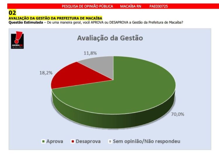 Ao serem perguntados “De uma maneira geral, qual avaliação você faz da gestão da Prefeitura de Macaíba?”, o instituto Agora Sei apurou o seguinte cenário: 60,1% dos entrevistados classificam a administração Emídio Júnior como ótima e boa, 28,7% afirmaram ser regular ou não têm opinião formada e apenas 11,2% classificaram a gestão como ruim ou péssima.