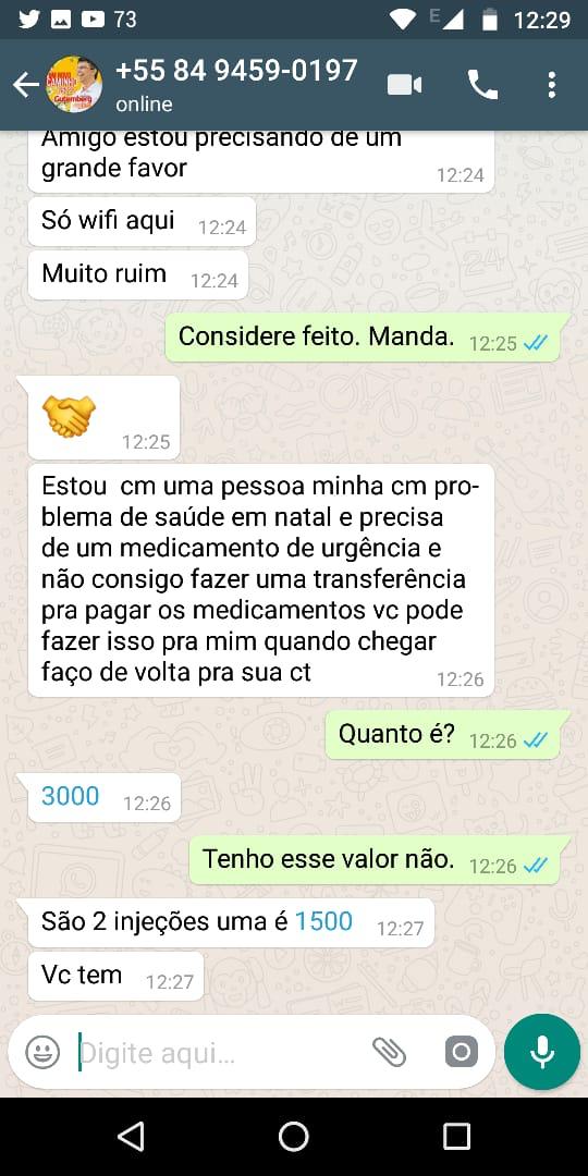 O golpista pede R$ 3 mil aos usuários para ajudar uma “pessoa dele” que está com problemas de saúde em Natal.
