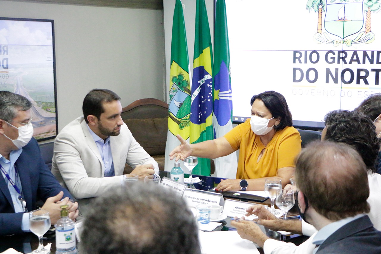 Na sala de reuniões da governadoria, Fátima Bezerra recebeu o diretor-presidente da Codevasf, Marcelo Andrade, que esteve acompanhado doo superintendente regional no RN, Wellington Dias; do assessor jurídico Alessandro Reis, e do chefe de gabinete Marcelo Silva Peixoto. Da equipe do Governo também acompanharam a governadora os secretários de Estado: Aldemir Freire (Seplan); Alexandre Lima (Sedraf); Daniel Cabral (Comunicação); secretários adjuntos – Socorro Batista (Gabinete Civil), Marcelo Lima Junior (Sape), Gaspar Andrade (Infraestrutura); o procurador-geral do Estado, Luiz Antônio Marinho; diretor-geral do DER, Manoel Marques, assessor técnico da Sedec, Guido Salvi.
