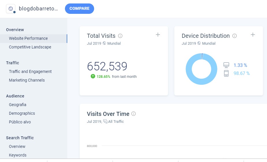 No mês de julho o Blog do Barreto registrou 652.539 acessos no mês de julho, um recorde, dentro da plataforma Similar Web.