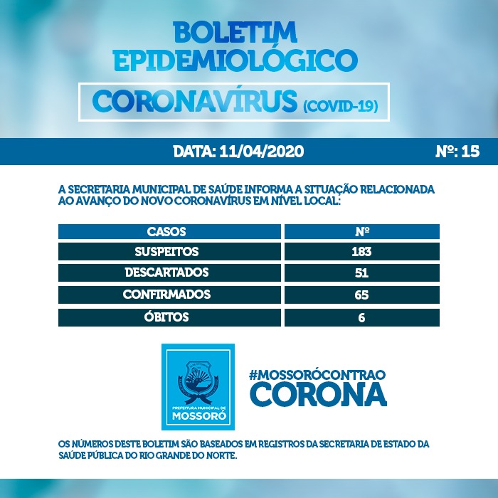 Atualmente Mossoró registra 183 casos suspeitos, 65 confirmados, 51 descartados e seis mortes pela Covid-19.