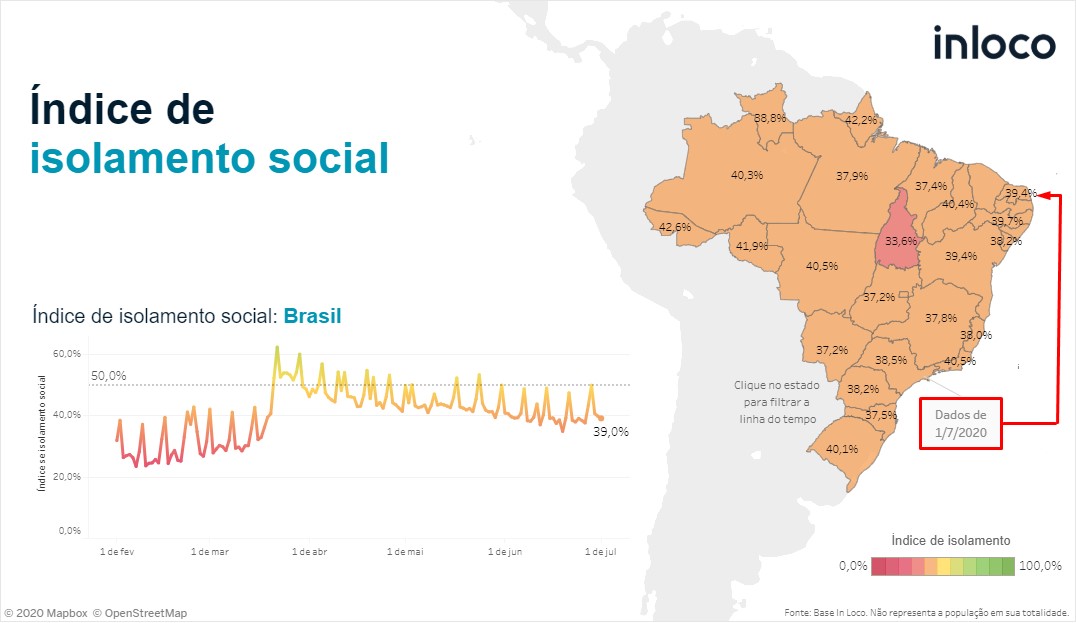 Para minimizar a circulação do novo coronavírus, o percentual de isolamento indicado pelas autoridades sanitárias é de 70%. Esse índice nunca foi alcançado pelo Estado, desde o início do período de monitoramento por parte do Inloco.