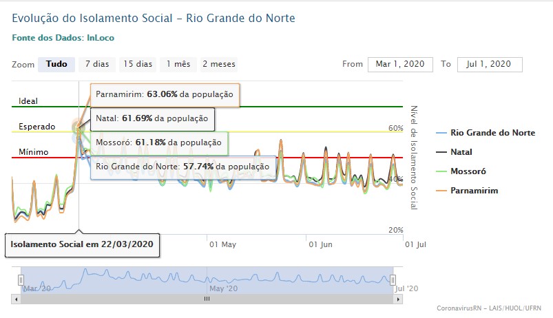 Mas não foi só o Rio Grande do Norte que não atingiu o índice ideal. Em todo o Brasil, apenas o estado de Santa Catarina chegou ao nível ideal de isolamento, com registro de 72,8% da população isolada no dia 22 de março. Essa também foi a única data em que o percentual foi alcançado, depois disso, maior índice alcançado no Estado foi de 64,8% em 29 de março.