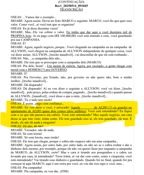 Em seguida eles falam sobre os riscos da operação quando Moabe dispara relatando a vivência anterior: “Eu vou dizer a você, é arriscado! Aquele de ALDO (?) eu guardei no apartamento de ALDO quase dois contos (dois milhões). Você está entendendo? Eu fiquei com o cu que não passava um cabelo. Você está entendendo? Mas aquele negócio, um cara desse aí que tem vinte, trinta conto. Ele tem guardado isso aí, ele tem guardado, ele tem. É doido, ele não dá nada a ninguém!”.