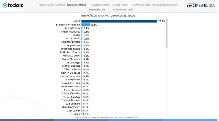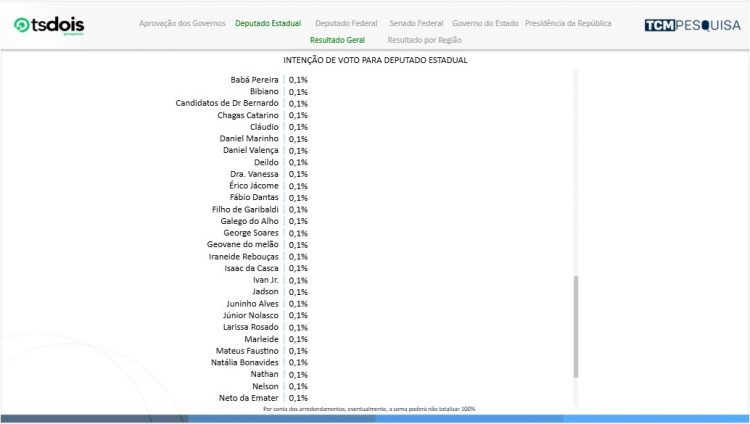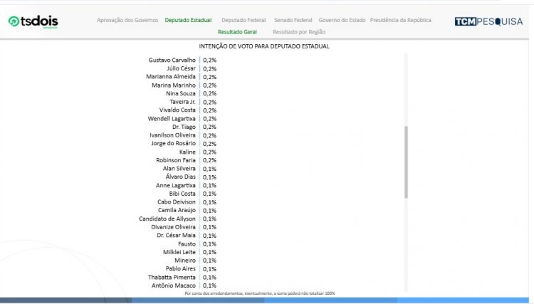 Completam a lista Dr. Bernardo (PSDB) e Coronel Azevedo com 0,6%, Adjuto Dias (MDB), Divaneide Basílio (PT), Dr. Gustavo Soares (PV), Francisco do PT, Galeno Torquato (PSDB) e Getúlio Rêgo (PSDB) com 0,5%.