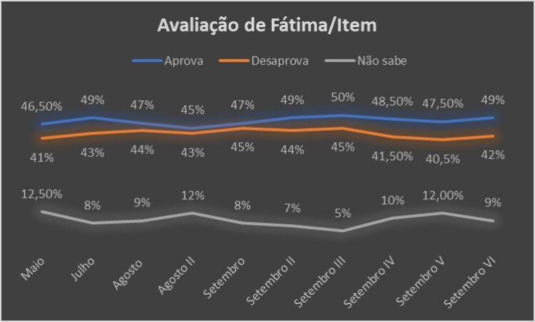 A aprovação de Fátima aumentou, desde a última pesquisa do Instituto ITEM, saindo de 47,5 para 49%. A reprovação do Governo também oscilou positivamente, de 40,5% para 42%. Confira a evolução dos números no gráfico.