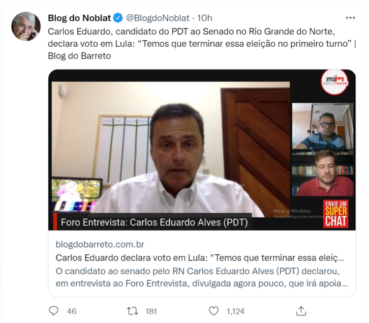 O jornalista Ricardo Noblat, que tem passagens pelo O Globo, Correio Braziliense, Veja e atualmente mantém uma coluna no Portal Metrópoles, repercutiu em seu Twitter, na noite de ontem (27), o furo de reportagem da Agência Moscow que foi publicado em primeira mão pelo Blog do Barreto, trazendo a posição do candidato ao Senado no RN, Carlos Eduardo Alves, sobre as eleições presidenciais de 2022. Veja a matéria AQUI.