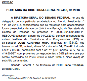 O ex-senador José Agripino (DEM) receberá uma pensão com proventos correspondentes a 26% (vinte e seis por cento) acrescidos de 25/35 (vinte e cinco trinta e cinco avos) do subsídio parlamentar.