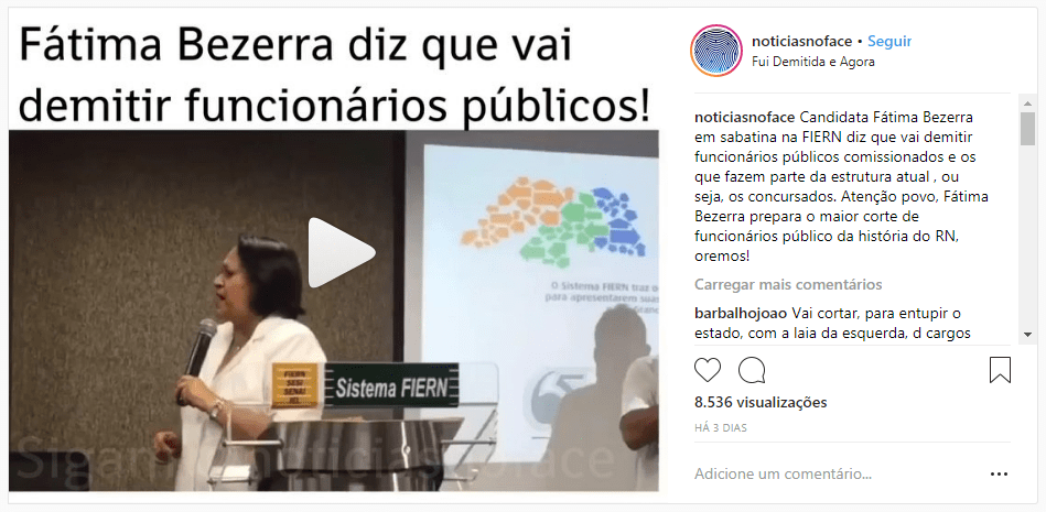 A publicação, feita em 20 de agosto de 2018 pela página @notíciasnoface, no Instagram, veiculou, em plena manchete, a seguinte afirmação: “Fátima Bezerra diz que vai demitir funcionários públicos!”