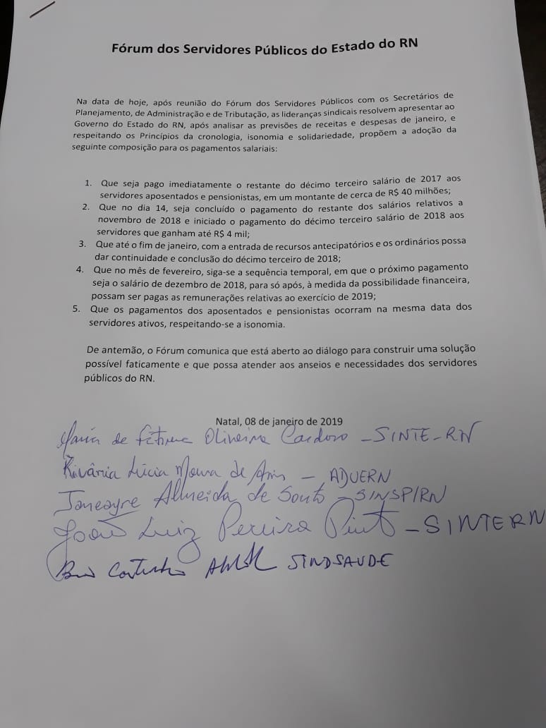 As lideranças sindicais do Rio Grande do Norte reunidas no Fórum dos Servidores Estaduais deliberaram uma proposta a ser apresentada a governadora Fátima Bezerra (PT).