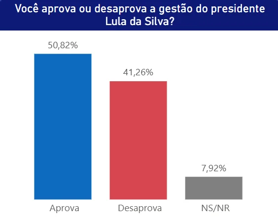 O presidente Lula tem aprovação de 50,82% e desaprovação de 41,26%. Outros 7,92% não souberam responder.
