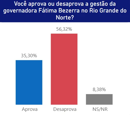Já a governadora Fátima Bezerra é aprovada por 35,30%, enquanto 56,32% desaprovam. Não souberam ou não responderam: 8,38%.