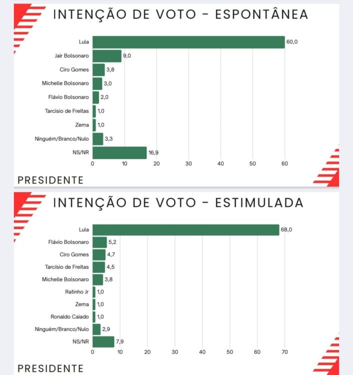 A pesquisa do Instituto Seta, realizada em Mossoró entre os dias 8 e 9 de dezembro, mostra um cenário amplamente favorável ao presidente Lula na disputa pela Presidência da República. Na intenção de voto espontânea, quando o eleitor responde sem a apresentação de nomes, Lula aparece com 60%, evidenciando forte recall eleitoral no município. Jair Bolsonaro surge bem atrás, com 9%, enquanto os demais nomes pontuam de forma residual.