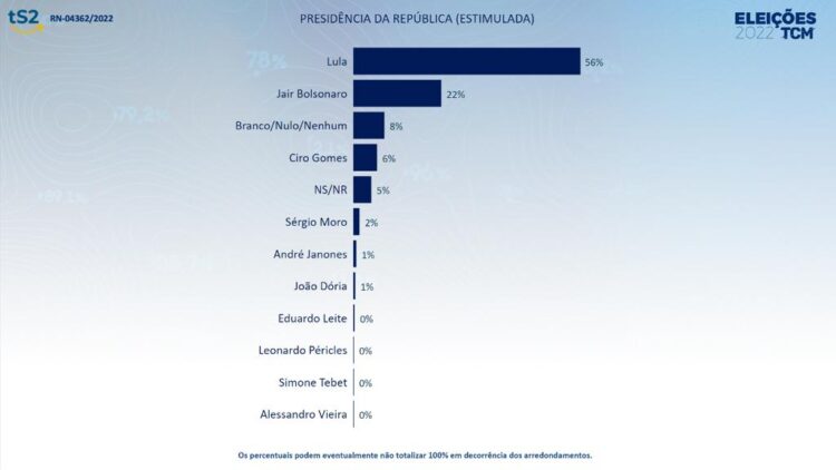A pesquisa TCM/TS2 divulgada pelo Portal TCM Notícia trouxe uma vantagem de 32 pontos percentuais para o ex-presidente Lula (PT) sobre o presidente Jair Bolsonaro (PL) no Rio Grande do Norte.