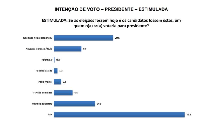 Com 45,3% das intenções de voto, ele tem o triplo das intenções de votos atribuídos a ex-primeira-dama Michelle Bolsonaro (PL), que tem 14,3%.