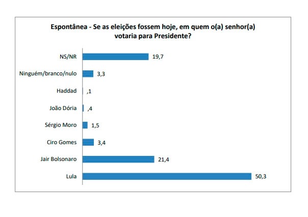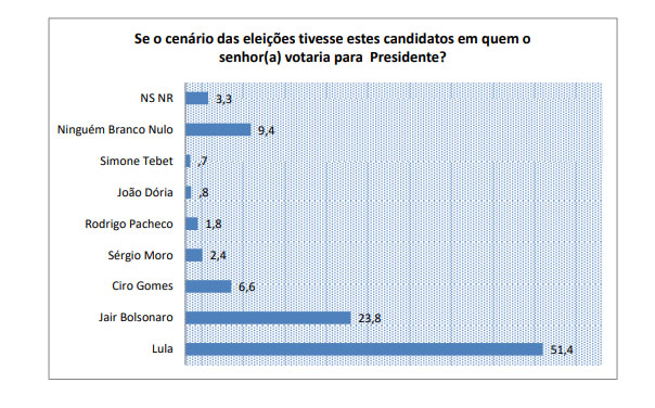 Na pesquisa Seta/Blog do BG divulgada hoje o ex-presidente tem uma vantagem próxima de 30 pontos percentuais sobre o presidente Jair Bolsonaro.